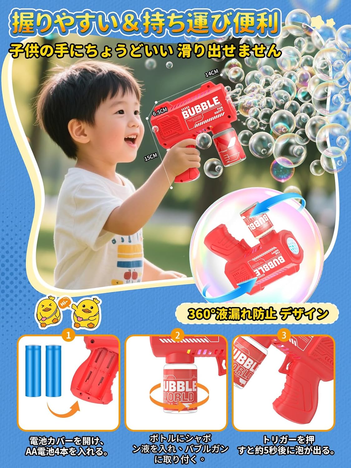 • 【新バージョン・ダブル泡出し口】 シャボン玉 電動 Zaahir バブルガン 電池式 自動 360°液漏れ防止 かわいいアヒル 6つ泡穴 長距離発射 大量の泡を発射 1分間に6000個 軽量 握りやすい LEDライト 予備ボトル2瓶 おもちゃ 結婚式 キャンプ 夏祭り 外遊び 誕生日プレゼント 女の子 男の子 (青と赤)