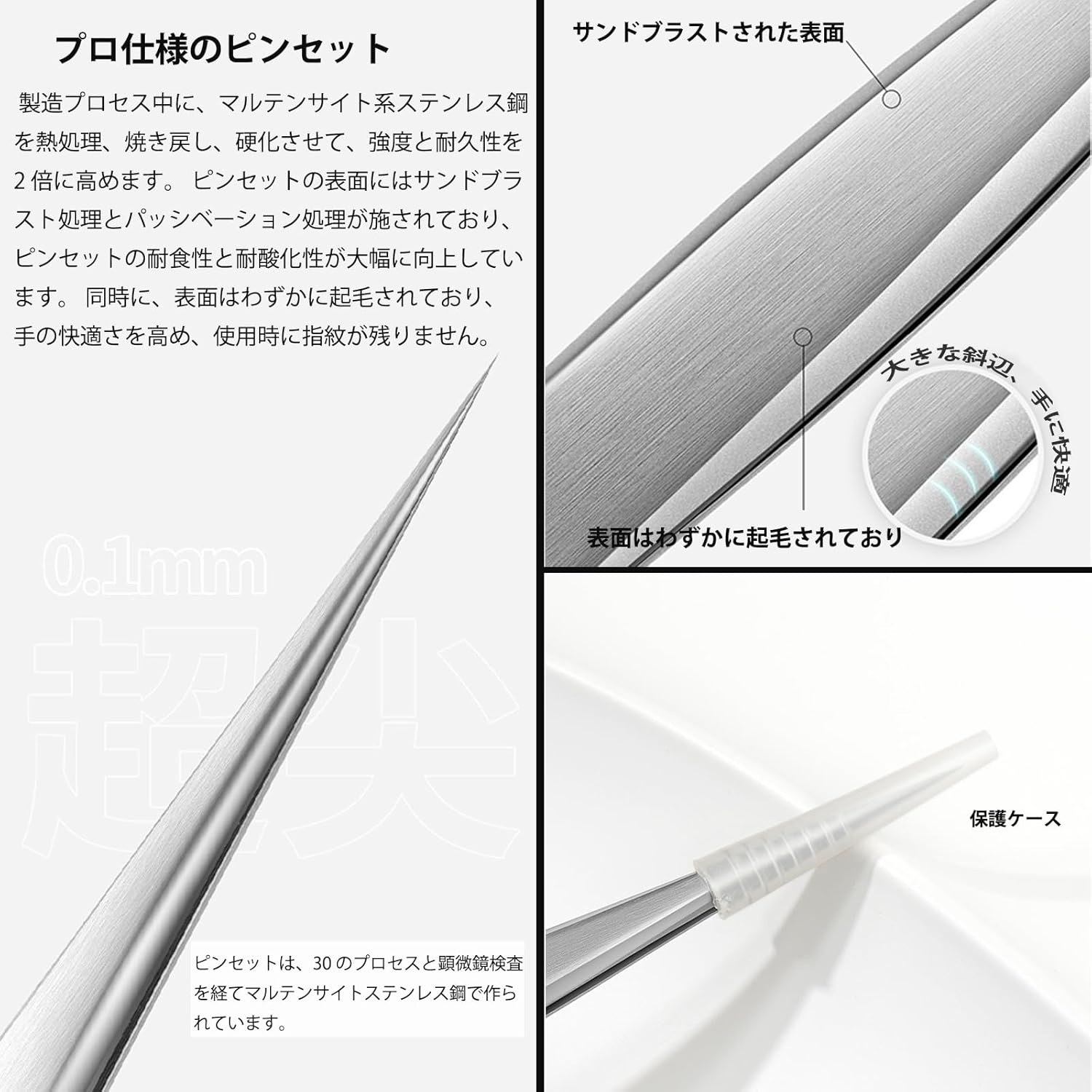 • AioBos ピンセット 精密 熱処理済み サンドブラスト パッシベーション ステンレス鋼 極細 ピンセット 0.1mm プロ仕様 防さび ステンレス 超精巧 プラモデル 業務用 縫製検品 収納ボックス付き