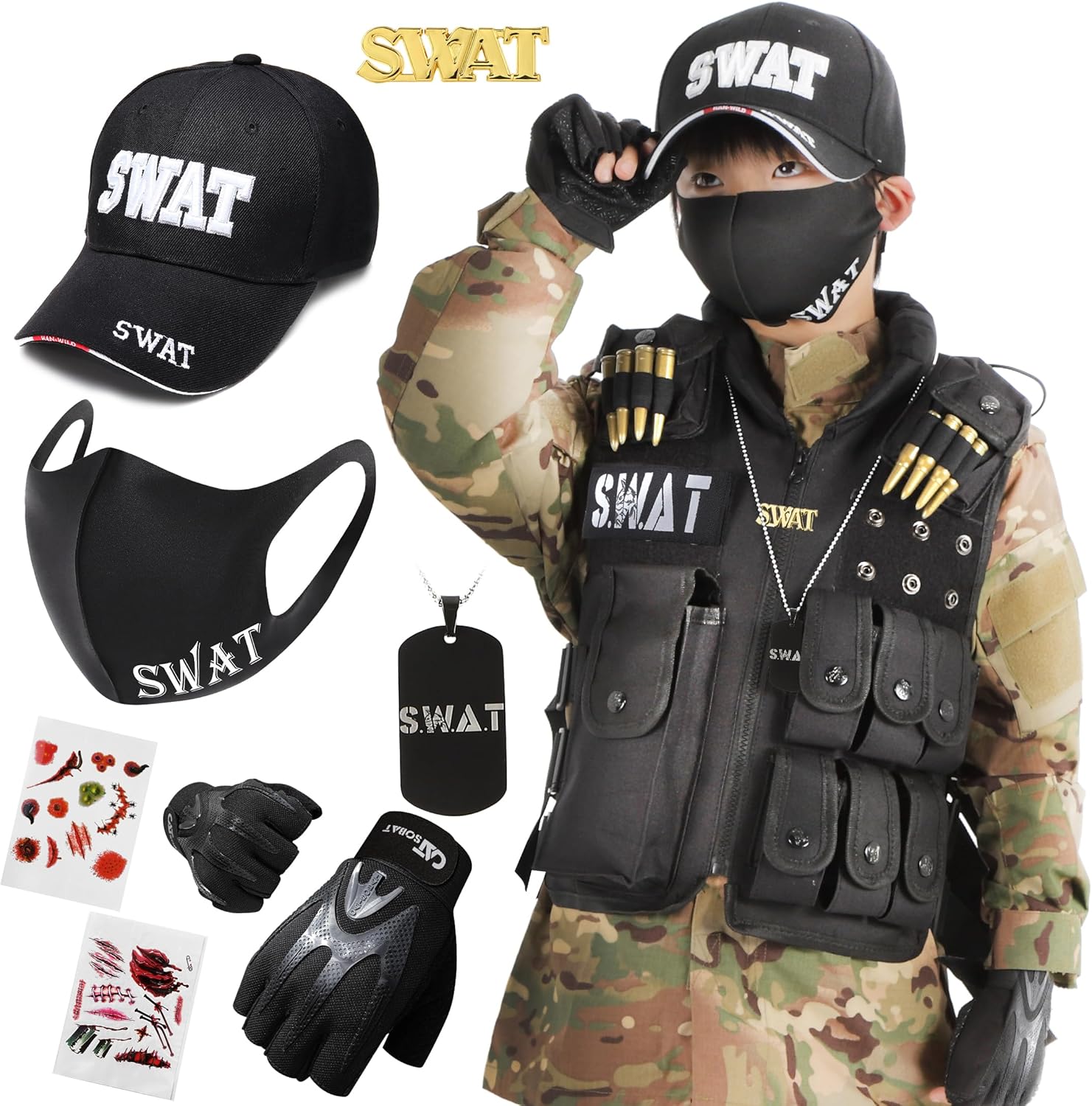 • [Catsobat] 【プロ監修デザイン 6点セット】 SWAT ベスト コスプレ コスチューム フルセット サバイバルゲーム 戦闘服 ハロウィン イベント用 ミリタリー 装備 メンズ レディース 【メーカー30日保証付き】 (子供用)
