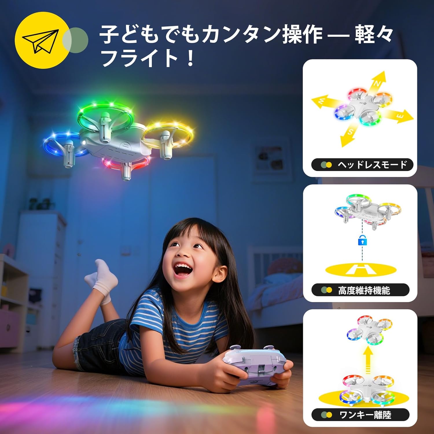 • Holy Stone ドローン 100g未満 子供向け 免許不要 小型ドローン おもちゃ 7色LEDライト 6種類の点灯モード バッテリー3個 21分飛行時間 スピード切替 サークル飛行 高速回転 室内ドローン HS180