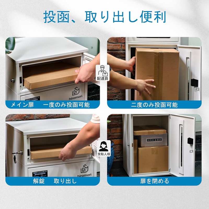 • HIROMORI 宅配ボックス 屋外 宅配box 96L 大容量 ポスト一体型 二段式 置き配ボックス 郵便受け 防水防錆 大型 案内ステッカー付き 簡単設置 移動式 盗難防止 おしゃれ キャスタロック機能 戸建て用「ホワイト」